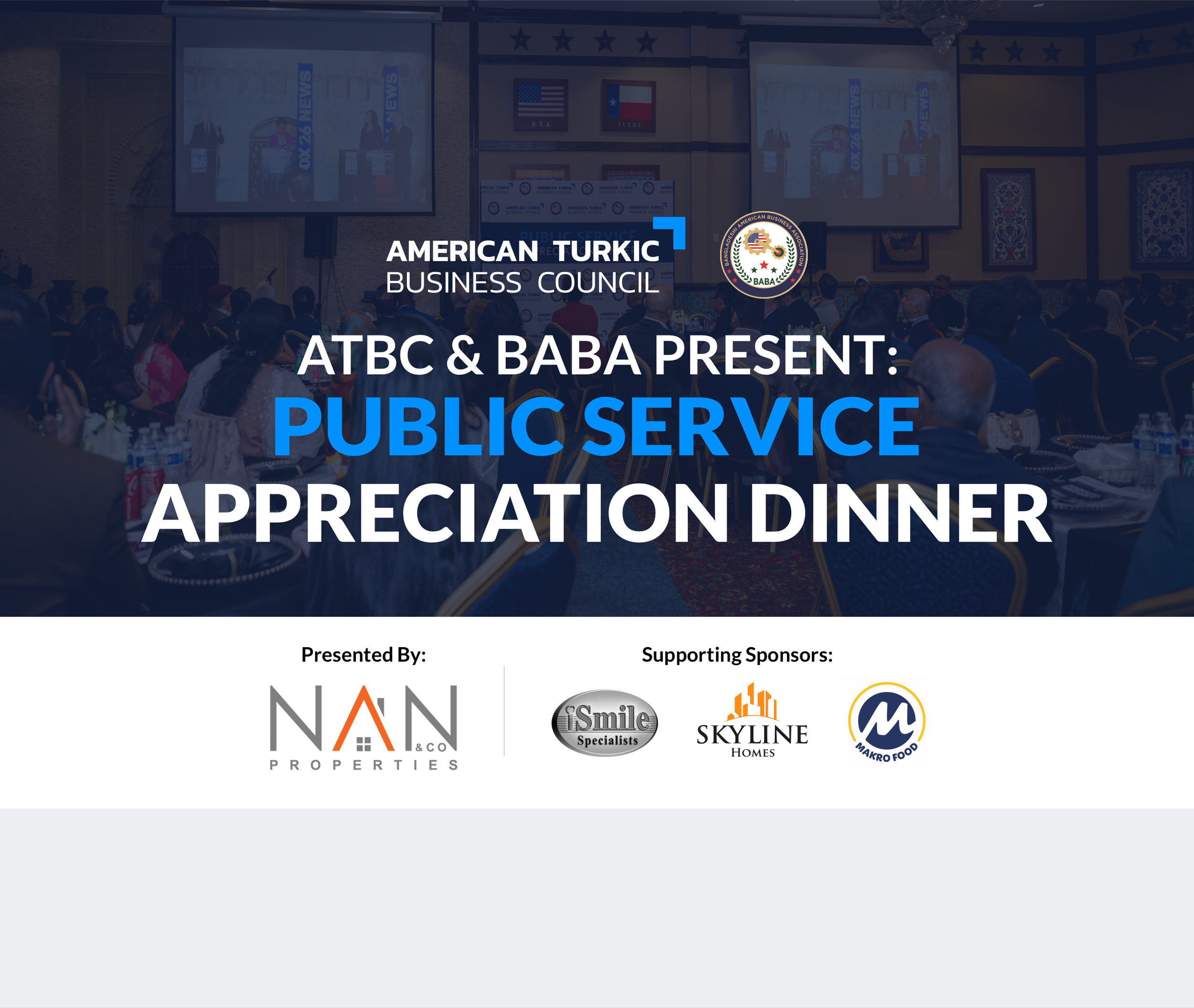 Join us for the ATBC & BABA Public Service Appreciation IFTAR Dinner, an exclusive evening honoring distinguished leaders in public service, journalism, education, and community leadership. This special gathering will bring together business executives, public officials, and community members to recognize award recipients and celebrate their contributions to our region.